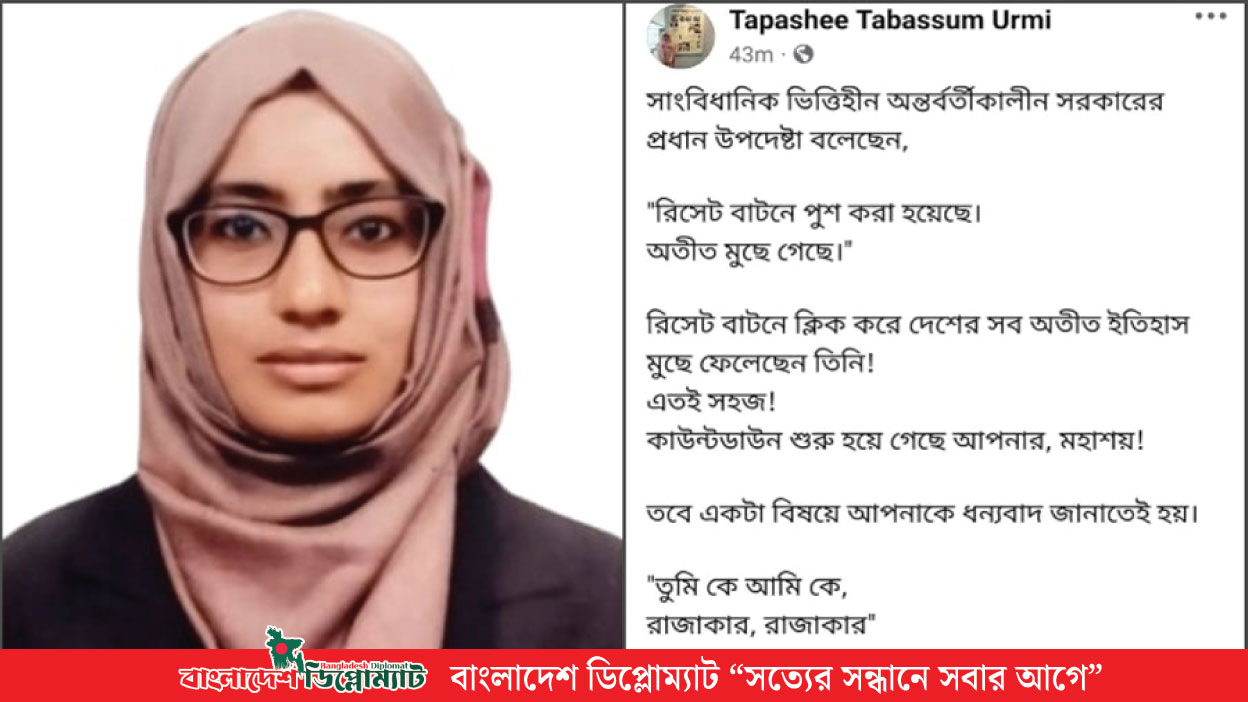 ফেসবুকে বিতর্কিত মন্তব্য করে সমালোচনায় পড়েছেন লালমনিরহাট জেলা প্রশাসনের নির্বাহী ম্যাজিস্ট্রেট তাপসী তাবাসসুম উর্মি। মূলত কয়েকদিন আগেই অন্তর্বর্তীকালীন সরকারের প্রধান
