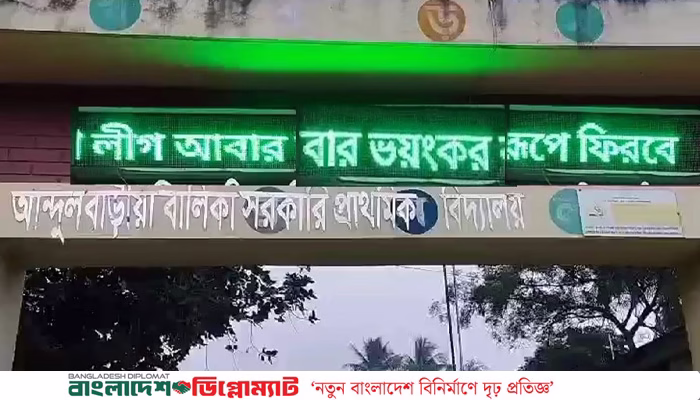 চুয়াডাঙ্গার জীবননগর উপজেলার একটি সরকারি প্রাথমিক বিদ্যালয়ের মূল ফটকের ডিজিটাল সাইনবোর্ডের স্ক্রিনে ‘আওয়ামী লীগ আবার ভয়ংকর রূপে ফিরবে’ লেখা ভেসে